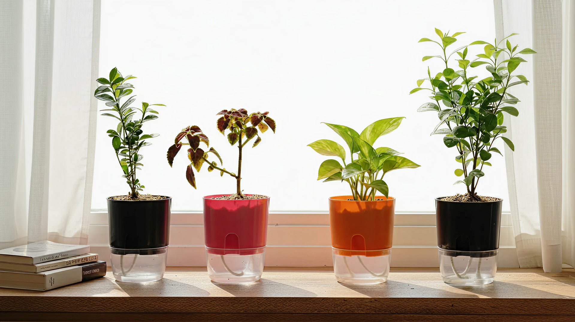 Set of 5 self watering pots (without plant) in green pink black grey orange color